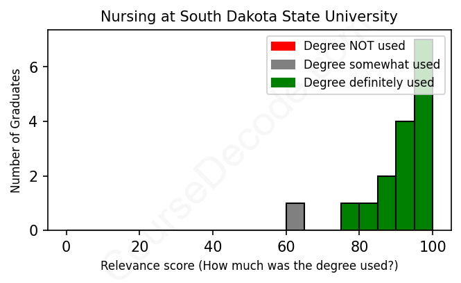 The verdict? Great! Overall, with an average relevance score of 91%, Nursing graduates from South Dakota State University have a substantially higher likelihood (+24%) of finding work in this field compared to the average graduate across all fields: