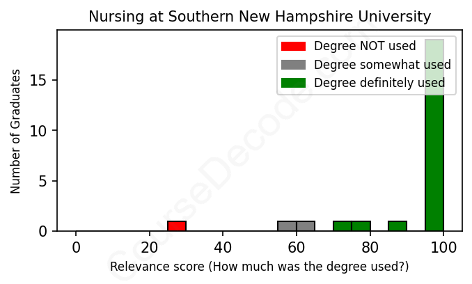 The verdict? Great! Overall, with an average relevance score of 91%, Nursing graduates from Southern New Hampshire University have a substantially higher likelihood (+24%) of finding work in this field compared to the average graduate across all fields: