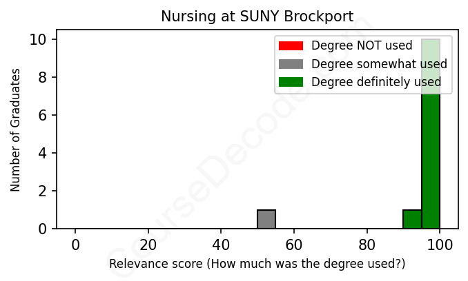 The verdict? Great! Overall, with an average relevance score of 95%, Nursing graduates from SUNY Brockport have a substantially higher likelihood (+28%) of finding work in this field compared to the average graduate across all fields: