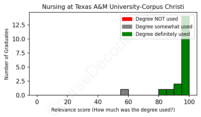 The verdict? Great! Overall, with an average relevance score of 95%, Nursing graduates from Texas A&M University-Corpus Christi have a substantially higher likelihood (+28%) of finding work in this field compared to the average graduate across all fields: