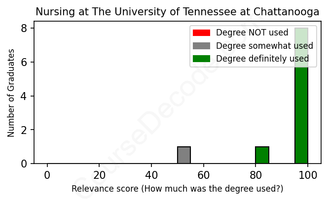 The verdict? Great! Overall, with an average relevance score of 93%, Nursing graduates from The University of Tennessee at Chattanooga have a substantially higher likelihood (+26%) of finding work in this field compared to the average graduate across all fields: