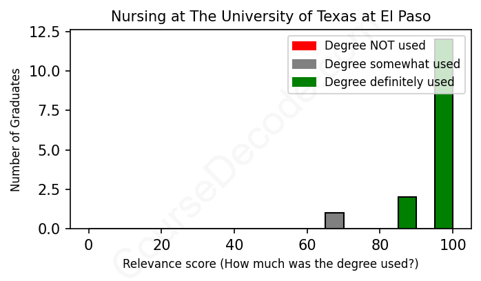 The verdict? Great! Overall, with an average relevance score of 95%, Nursing graduates from The University of Texas at El Paso have a substantially higher likelihood (+28%) of finding work in this field compared to the average graduate across all fields: