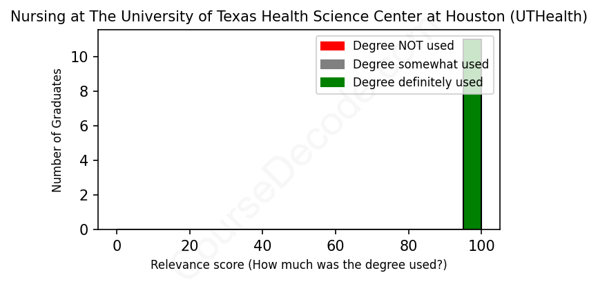 The verdict? Fantastic! Overall, with an average relevance score of 99%, Nursing graduates from The University of Texas Health Science Center at Houston (UTHealth) have an exceptionally higher likelihood (+32%) of finding work in this field compared to the average graduate across all fields: