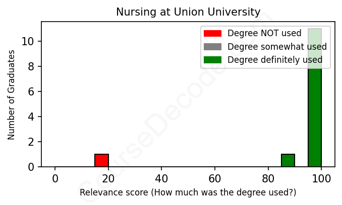 The verdict? Great! Overall, with an average relevance score of 92%, Nursing graduates from Union University have a substantially higher likelihood (+25%) of finding work in this field compared to the average graduate across all fields: