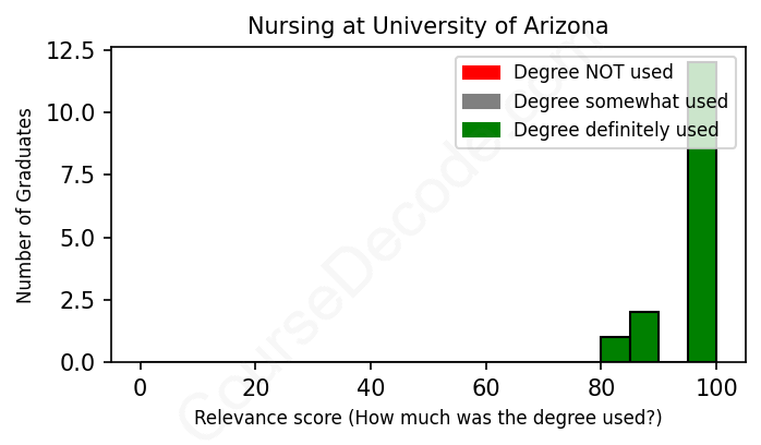 The verdict? Great! Overall, with an average relevance score of 96%, Nursing graduates from University of Arizona have a substantially higher likelihood (+29%) of finding work in this field compared to the average graduate across all fields: