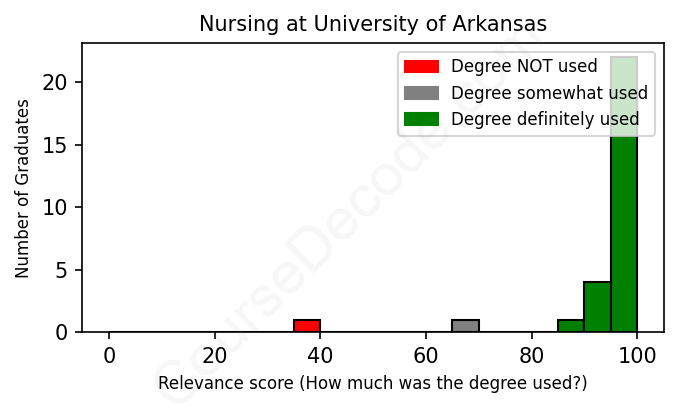 The verdict? Great! Overall, with an average relevance score of 95%, Nursing graduates from University of Arkansas have a substantially higher likelihood (+28%) of finding work in this field compared to the average graduate across all fields: