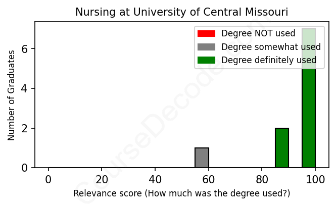 The verdict? Great! Overall, with an average relevance score of 93%, Nursing graduates from University of Central Missouri have a substantially higher likelihood (+26%) of finding work in this field compared to the average graduate across all fields: