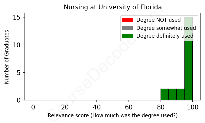 The verdict? Great! Overall, with an average relevance score of 96%, Nursing graduates from University of Florida have a substantially higher likelihood (+29%) of finding work in this field compared to the average graduate across all fields: