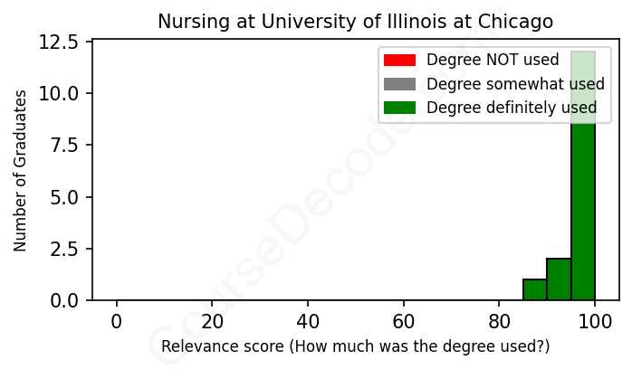 The verdict? Great! Overall, with an average relevance score of 97%, Nursing graduates from University of Illinois at Chicago have a substantially higher likelihood (+30%) of finding work in this field compared to the average graduate across all fields: