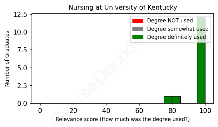 The verdict? Great! Overall, with an average relevance score of 96%, Nursing graduates from University of Kentucky have a substantially higher likelihood (+29%) of finding work in this field compared to the average graduate across all fields: