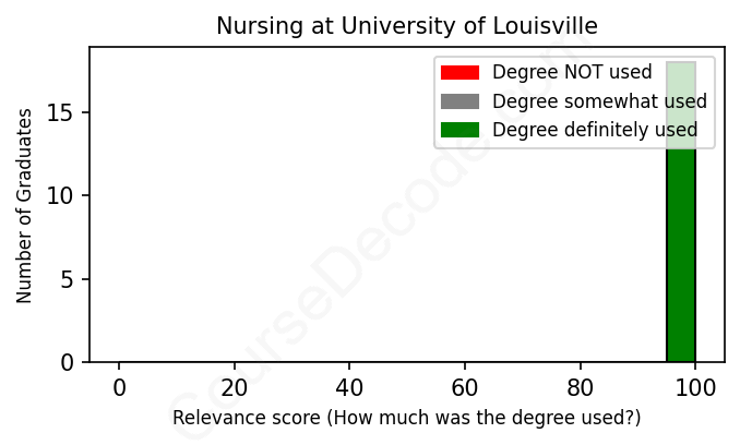 The verdict? Fantastic! Overall, with an average relevance score of 100%, Nursing graduates from University of Louisville have an exceptionally higher likelihood (+33%) of finding work in this field compared to the average graduate across all fields: