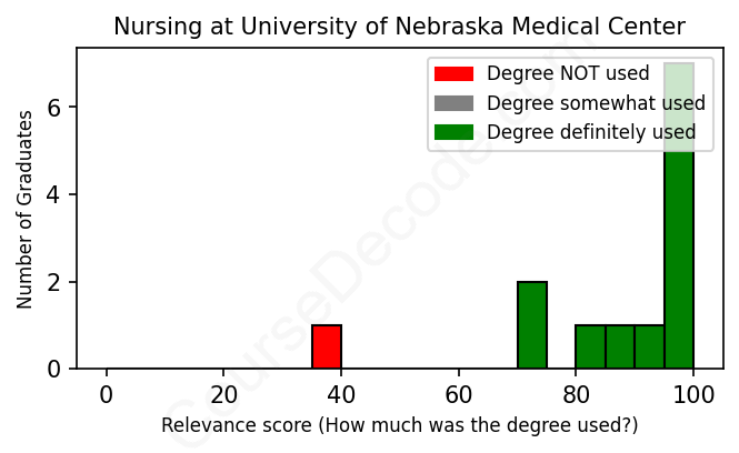 The verdict? Great! Overall, with an average relevance score of 88%, Nursing graduates from University of Nebraska Medical Center have a substantially higher likelihood (+21%) of finding work in this field compared to the average graduate across all fields: