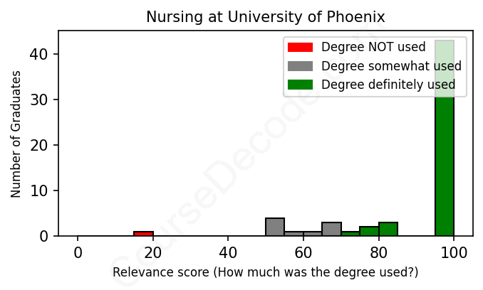The verdict? Great! Overall, with an average relevance score of 89%, Nursing graduates from University of Phoenix have a substantially higher likelihood (+22%) of finding work in this field compared to the average graduate across all fields: