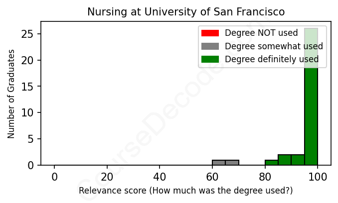 The verdict? Great! Overall, with an average relevance score of 96%, Nursing graduates from University of San Francisco have a substantially higher likelihood (+29%) of finding work in this field compared to the average graduate across all fields: