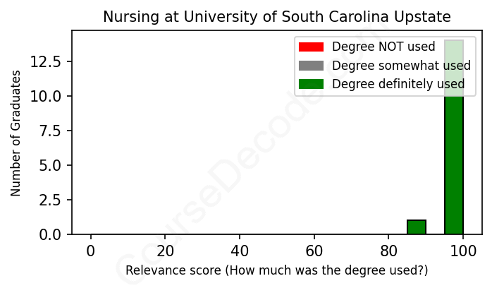 The verdict? Fantastic! Overall, with an average relevance score of 99%, Nursing graduates from University of South Carolina Upstate have an exceptionally higher likelihood (+32%) of finding work in this field compared to the average graduate across all fields: