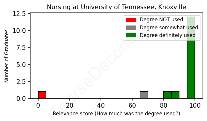 The verdict? Great! Overall, with an average relevance score of 89%, Nursing graduates from University of Tennessee, Knoxville have a substantially higher likelihood (+22%) of finding work in this field compared to the average graduate across all fields: