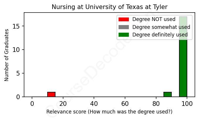 The verdict? Great! Overall, with an average relevance score of 94%, Nursing graduates from University of Texas at Tyler have a substantially higher likelihood (+27%) of finding work in this field compared to the average graduate across all fields: