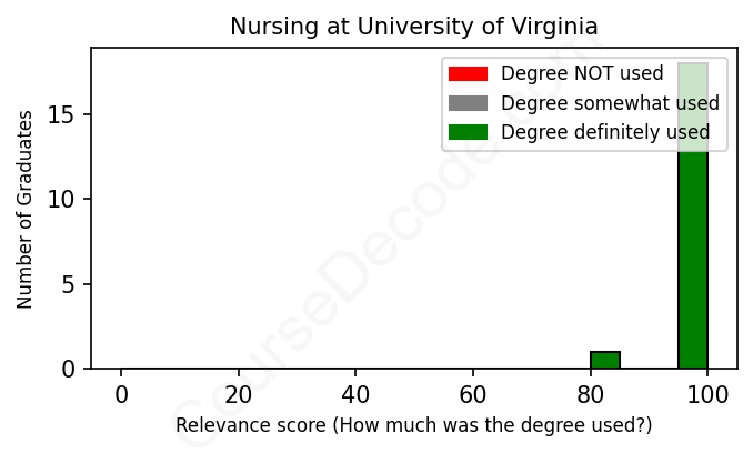 The verdict? Fantastic! Overall, with an average relevance score of 99%, Nursing graduates from University of Virginia have an exceptionally higher likelihood (+32%) of finding work in this field compared to the average graduate across all fields: