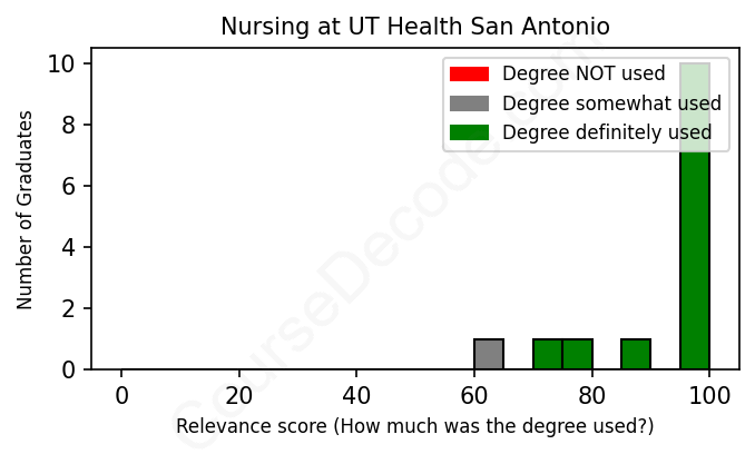 The verdict? Great! Overall, with an average relevance score of 92%, Nursing graduates from UT Health San Antonio have a substantially higher likelihood (+25%) of finding work in this field compared to the average graduate across all fields: