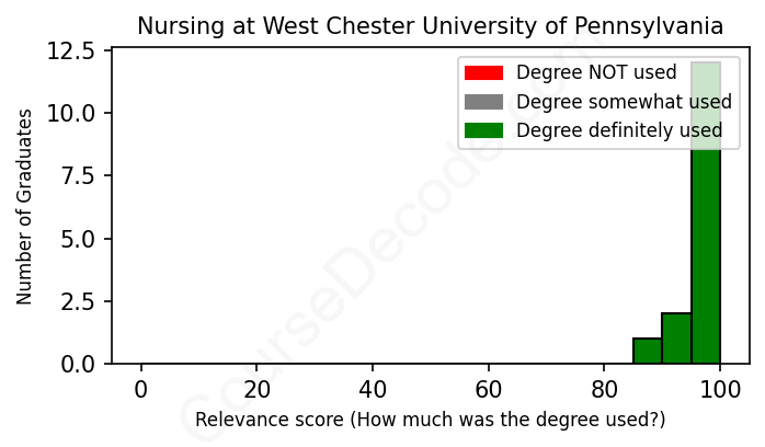 The verdict? Great! Overall, with an average relevance score of 97%, Nursing graduates from West Chester University of Pennsylvania have a substantially higher likelihood (+30%) of finding work in this field compared to the average graduate across all fields: