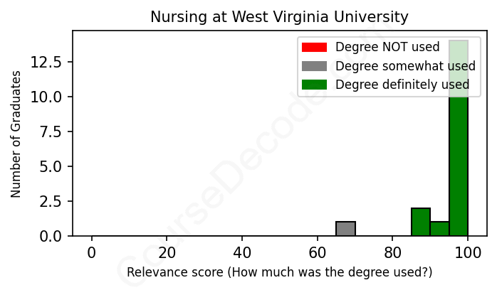 The verdict? Great! Overall, with an average relevance score of 95%, Nursing graduates from West Virginia University have a substantially higher likelihood (+28%) of finding work in this field compared to the average graduate across all fields: