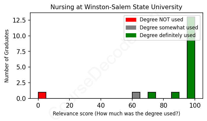 The verdict? Great! Overall, with an average relevance score of 89%, Nursing graduates from Winston-Salem State University have a substantially higher likelihood (+22%) of finding work in this field compared to the average graduate across all fields: