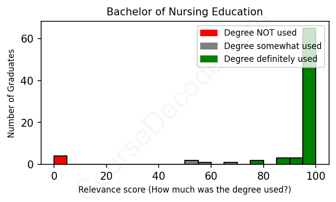 The verdict? Great! Overall, with an average relevance score of 91%, Nursing Education graduates have a substantially higher likelihood (+24%) of finding work in this field compared to the average graduate across all fields: