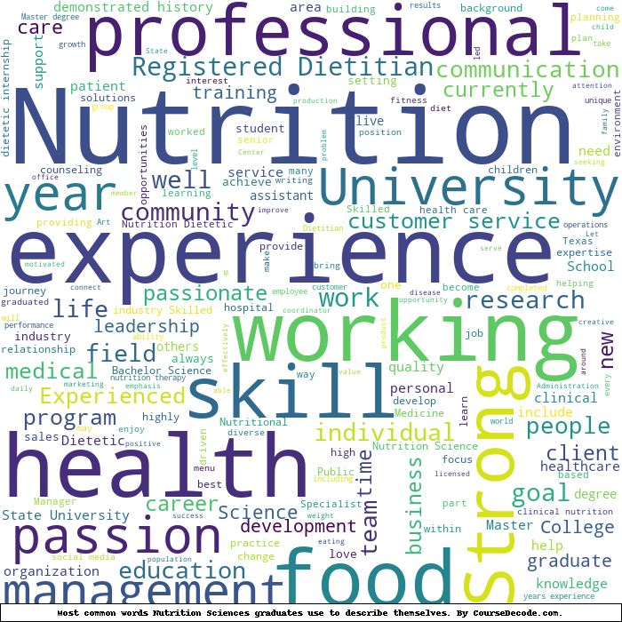 Here is a visual representation of the most common words seen in the "about" section of LinkedIn profiles who have a Bachelor degree in Nutrition Sciences. This may or may not be useful: