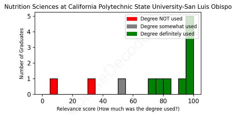 The verdict? Above average. Overall, with an average relevance score of 75%, Nutrition Sciences graduates from California Polytechnic State University-San Luis Obispo have a higher likelihood (+8%) of finding work in this field compared to the average graduate across all fields: