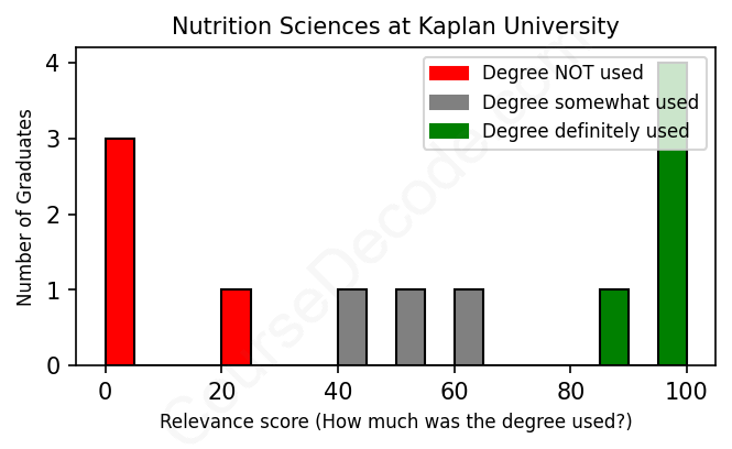 The verdict? Significantly below average. Overall, with an average relevance score of 54%, Nutrition Sciences graduates from Kaplan University have a much lower likelihood (-13%) of finding work in this field compared to the average graduate across all fields: