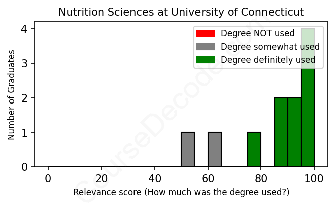 The verdict? Significantly above average. Overall, with an average relevance score of 85%, Nutrition Sciences graduates from University of Connecticut have a much higher likelihood (+18%) of finding work in this field compared to the average graduate across all fields:
