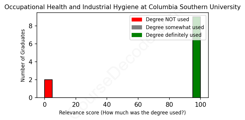 The verdict? Significantly above average. Overall, with an average relevance score of 81%, Occupational Health and Industrial Hygiene graduates from Columbia Southern University have a much higher likelihood (+14%) of finding work in this field compared to the average graduate across all fields:
