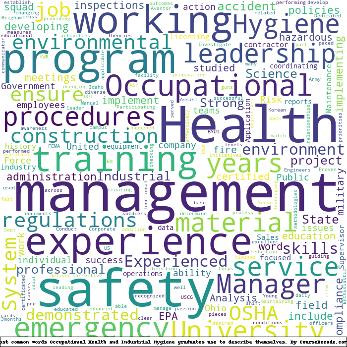 Here is a visual representation of the most common words seen in the "about" section of LinkedIn profiles who have a Bachelor degree in Occupational Health and Industrial Hygiene (this is across all Occupational Health and Industrial Hygiene graduates we've analyzed, not just those who went to Columbia Southern University). This may or may not be useful: