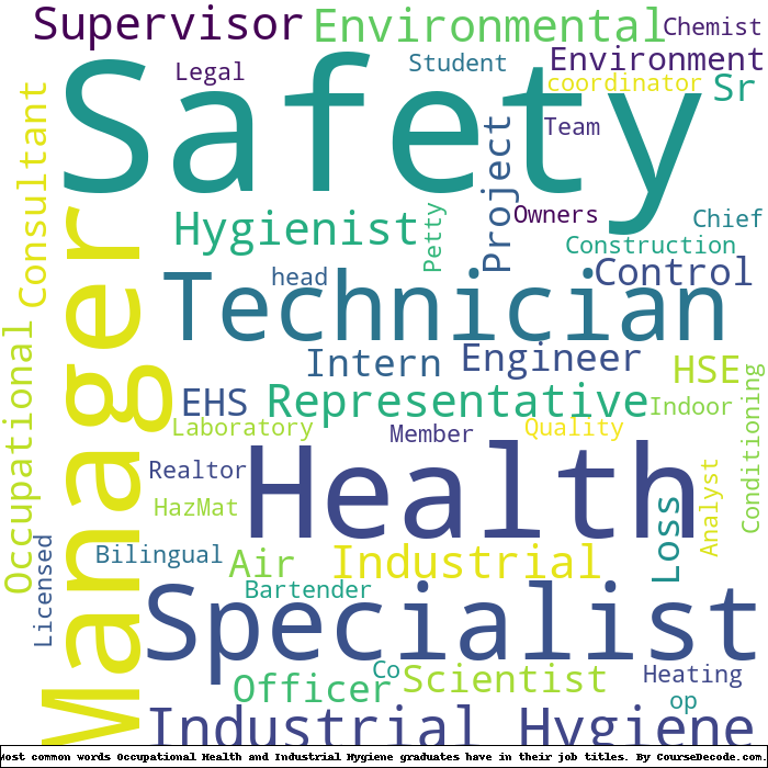 Here is a visual representation of the most common words in job titles for Occupational Health and Industrial Hygiene graduates (this is across all Occupational Health and Industrial Hygiene graduates we've analyzed, not just those who went to Columbia Southern University):