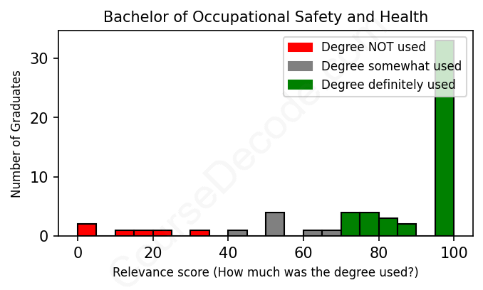 The verdict? Significantly above average. Overall, with an average relevance score of 80%, Occupational Safety and Health graduates have a much higher likelihood (+13%) of finding work in this field compared to the average graduate across all fields: