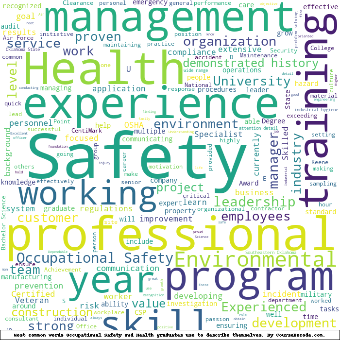 Here is a visual representation of the most common words seen in the "about" section of LinkedIn profiles who have a Bachelor degree in Occupational Safety and Health. This may or may not be useful: