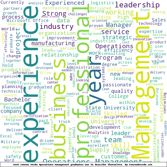 Here is a visual representation of the most common words seen in the "about" section of LinkedIn profiles who have a Bachelor degree in Operations Management. This may or may not be useful: