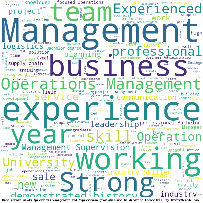 Here is a visual representation of the most common words seen in the "about" section of LinkedIn profiles who have a Bachelor degree in Operations Management and Supervision. This may or may not be useful: