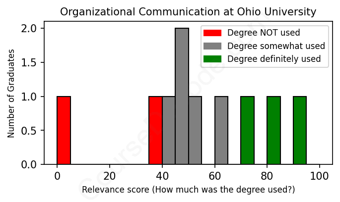 The verdict? Significantly below average. Overall, with an average relevance score of 53%, Organizational Communication graduates from Ohio University have a much lower likelihood (-14%) of finding work in this field compared to the average graduate across all fields: