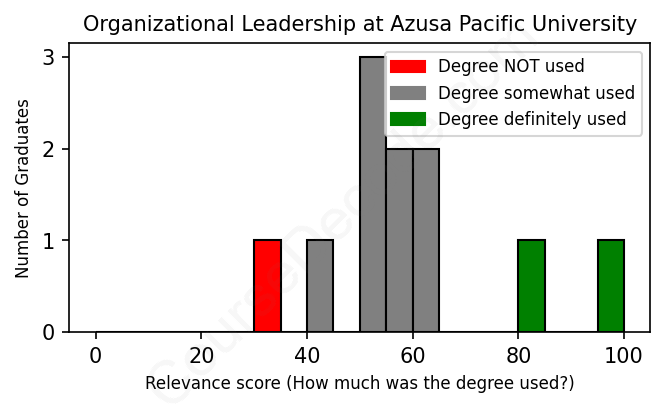 The verdict? Below average. Overall, with an average relevance score of 58%, Organizational Leadership graduates from Azusa Pacific University have a lower likelihood (-9%) of finding work in this field compared to the average graduate across all fields: