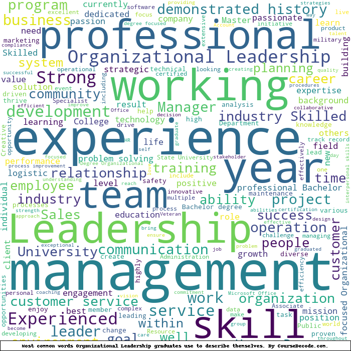 Here is a visual representation of the most common words seen in the "about" section of LinkedIn profiles who have a Bachelor degree in Organizational Leadership (this is across all Organizational Leadership graduates we've analyzed, not just those who went to Azusa Pacific University). This may or may not be useful: