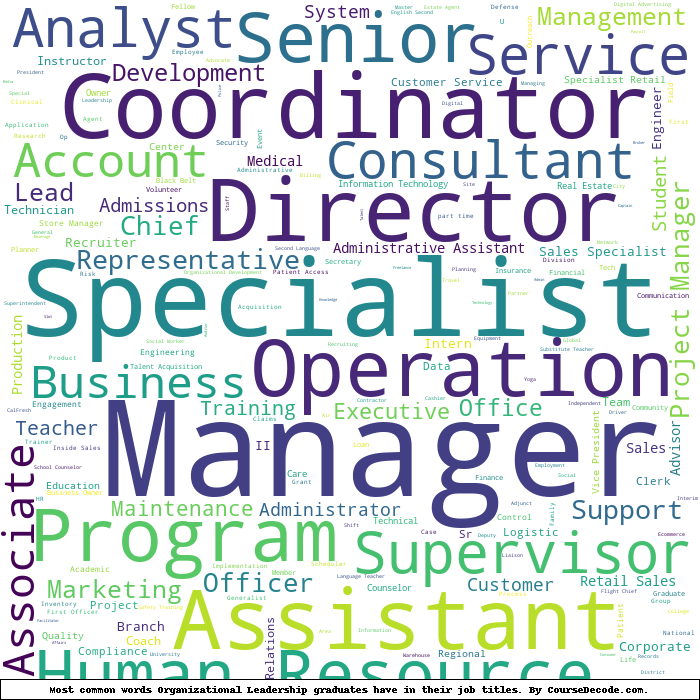 Here is a visual representation of the most common words in job titles for Organizational Leadership graduates (this is across all Organizational Leadership graduates we've analyzed, not just those who went to Azusa Pacific University):