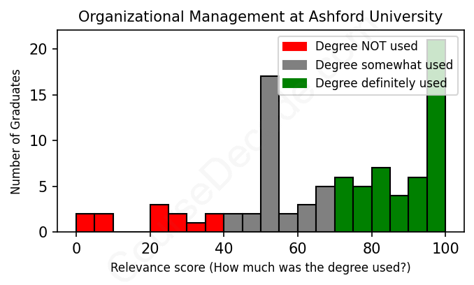 The verdict? Slightly above average. Overall, with an average relevance score of 68%, Organizational Management graduates from Ashford University have a slightly higher likelihood (+1%) of finding work in this field compared to the average graduate across all fields: