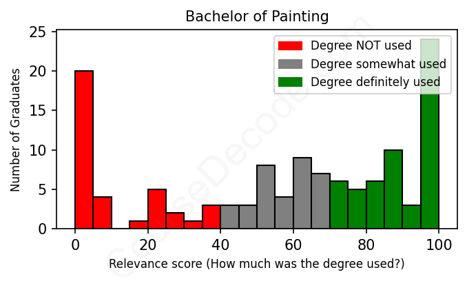 The verdict? Below average. Overall, with an average relevance score of 57%, Painting graduates have a lower likelihood (-10%) of finding work in this field compared to the average graduate across all fields: