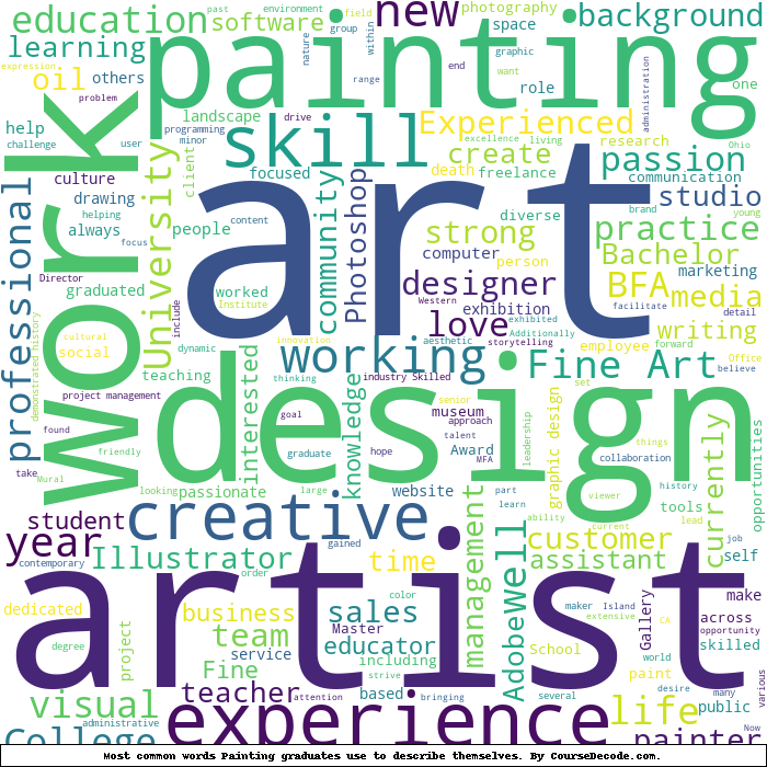 Here is a visual representation of the most common words seen in the "about" section of LinkedIn profiles who have a Bachelor degree in Painting. This may or may not be useful: