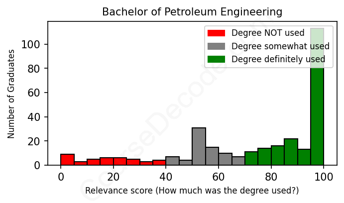 The verdict? Above average. Overall, with an average relevance score of 73%, Petroleum Engineering graduates have a higher likelihood (+6%) of finding work in this field compared to the average graduate across all fields: