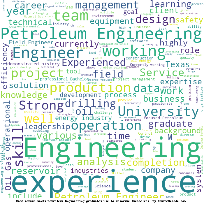 Here is a visual representation of the most common words seen in the "about" section of LinkedIn profiles who have a Bachelor degree in Petroleum Engineering. This may or may not be useful: