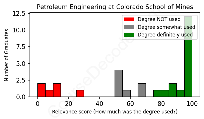 The verdict? Slightly above average. Overall, with an average relevance score of 69%, Petroleum Engineering graduates from Colorado School of Mines have a slightly higher likelihood (+2%) of finding work in this field compared to the average graduate across all fields: