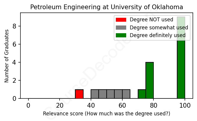 The verdict? Significantly above average. Overall, with an average relevance score of 78%, Petroleum Engineering graduates from University of Oklahoma have a much higher likelihood (+11%) of finding work in this field compared to the average graduate across all fields: