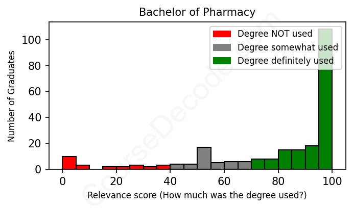 The verdict? Significantly above average. Overall, with an average relevance score of 78%, Pharmacy graduates have a much higher likelihood (+11%) of finding work in this field compared to the average graduate across all fields: